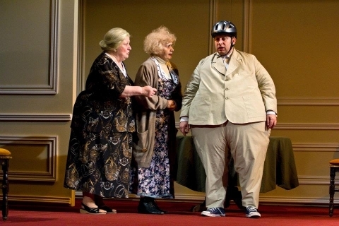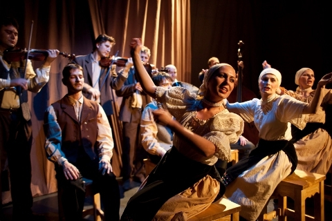 (a közönség a színpadon foglal helyet, román nyelvű előadás)